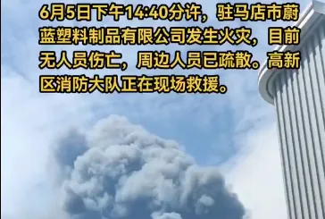 唐人日报6月11日讯:河南驻马店市高新区蔚蓝塑料制品有限公司突发火灾。火情发生后,现场迅速升起浓烟,火势蔓延迅猛,引发周边群众关注。目前,驻马店高新区消防大队已第一时间赶赴现场展开扑救和处置工作。