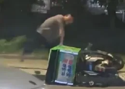 从视频中可以看到,这位外卖员身穿工作服,趴在地上放声大哭,嘴里不停念叨着什么,情绪极度激动。他的外卖车被反复砸向地面,零件散落一地,路人不敢靠近,有人默默站在远处拍摄,也有人小心上前试图安慰。
