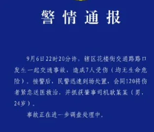 唐人日报9月8日讯:武汉市江汉区公安分局交通大队发布通告称,9月6日22时20分许,江汉区花楼街交通路路口发生一起严重交通事故,造成7人受伤。所幸,经初步确认,伤者均无生命危险。