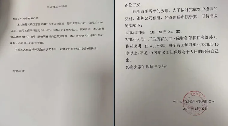 唐人日报3月29日讯:近日,湖北芯映光电有限公司和佛山汇创塑料模具有限公司的强制加班政策引起了公众和劳动监管部门的广泛关注。湖北芯映光电有限公司近日向员工发放了“自愿加班申请书”,要求员工签署以证明其加班是基于自愿,而佛山汇创塑料模具有限公司则通过内部通知明确要求员工每月至少加班10晚,未达标者需自行承担部分社保费用。