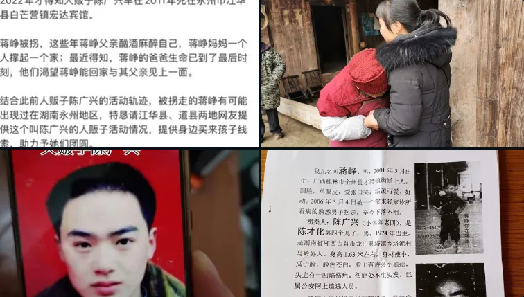 唐人日报3月22日讯:多年前,年仅5岁的蒋峥在家乡被湖南人贩子陈广兴拐走。蒋峥的母亲多年来不懈寻找儿子,她不仅多次前往陈广兴的家乡,还曾为人贩子父母干农活,试图感化他们,迫使他们透露儿子的下落。蒋母甚至认陈广兴的父母为干爹干妈,然而这些努力都未能改变悲剧的结局。
