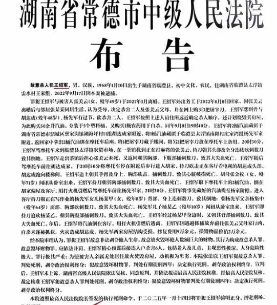 案件引发社会震惊,王昭军因涉嫌杀害6人,被湖南常德中级法院判处死刑,并于近日执行。法院布告显示,王昭军的杀人行为手段残忍,社会影响恶劣,判决维持原判。