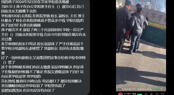 家长在维权过程中表示,虽然自己知道这种方式可能违法,但在多次寻求帮助未果后,最终选择了通过这种方式引起社会关注。家长称,孩子在文华学校宿舍跳楼的原因尚未得到明确的调查结论,学校方面也未提供有效的解释和应有的安抚。家长对学校在学生心理疏导、管理方面的疏忽表示强烈抗议。