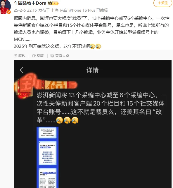 唐人日报2月8日讯:近日,微博大V“车圈朵教主”爆料,澎湃新闻进行大规模裁员,将13个采编中心减少至6个,并一次性关停多个栏目及社交媒体账号。同时,知名汽车媒体易车也传出裁员消息。