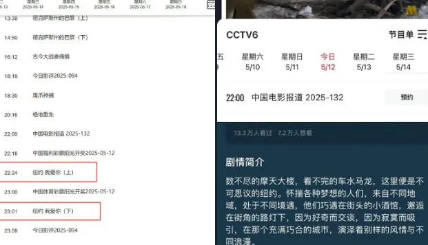 据悉,《纽约,我爱你》由多位国际导演联合执导,讲述发生在纽约这座多元城市中的11段爱情故事。然而该片因涉及敏感城市背景及文化描绘,在国内平台上一直处于相对低调状态。此次被安排在央视电影频道晚间档播出,立刻引发网友期待,有人称“罕见地看到CCTV6要播真正的国际文艺片”。