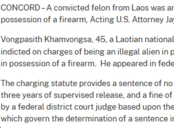 唐人日报5月22日讯:新罕布什尔州斯特拉福德县执法部门日前逮捕一名非法移民,老挝籍公民Vongpasith Khamvongsa,因其涉嫌非法持有枪支,目前正面临联邦重罪指控。根据联邦法院文件,他被控“非法移民持有枪支”以及“重罪犯持有枪支”两项罪名。