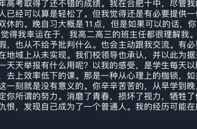 该学生表示,尽管自己所就读的学校已是合肥为数不多“相对宽松”的高中之一,但仍要接受每天晚自习至晚上11点的高强度学习安排,几乎没有喘息空间。“我们有双休算是‘幸福’,但代价是每天像机器一样从早压到深夜。”他说。