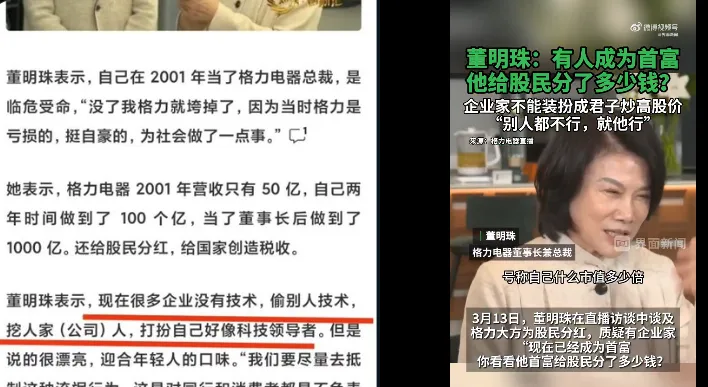 唐人日报3月14日讯:近日,格力电器董事长董明珠在直播访谈中直言不讳地批评部分企业缺乏核心技术,依赖资本运作炒作股价,而非真正推动科技创新。她表示:“有人成了首富,但你看看给股民分了多少钱?只是靠炒高股价。”