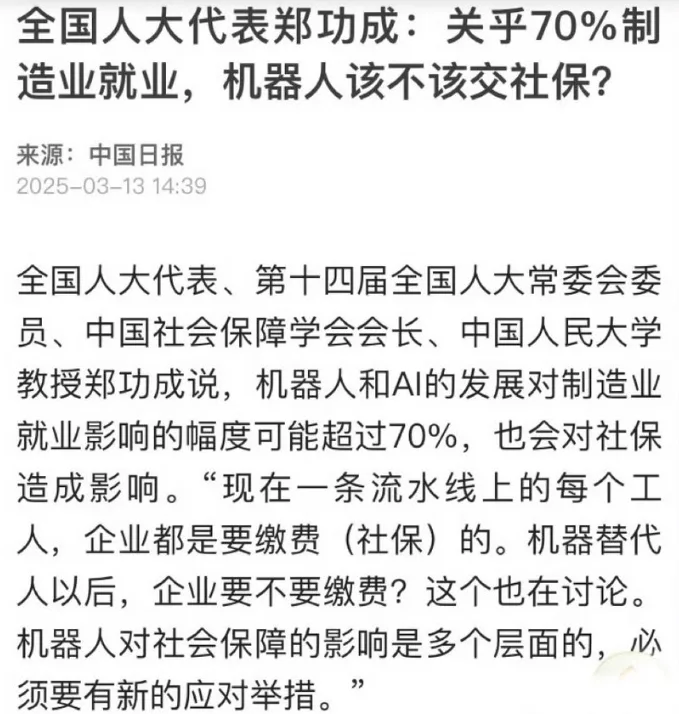因此,郑功成建议,政府应研究制定**“机器人社保税”**或类似政策,要求企业为使用机器人替代人类劳动支付一定比例的社保费用。这笔资金可以用于补充社保基金,帮助被人工智能和自动化替代的劳动者转型再就业,确保社会保障体系的可持续发展。