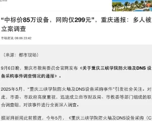 唐人日报9月8日讯:重庆市教委在官方网站发布《关于重庆三峡学院防火墙及DNS设备采购事件调查情况的通报》,引发广泛关注。这起看似普通的设备采购案,因“299元路由器冒充防火墙”而震惊舆论。通报明确指出,供应商重庆洪正公司在投标过程中虚假承诺,以不实材料骗取投标资格,并将一款低廉的路由器伪装成高端防火墙设备进行报标。而重庆三峡学院在履行监管职责中失察失责,重庆市政府采购中心和专家评审环节也存在严重形式主义。
