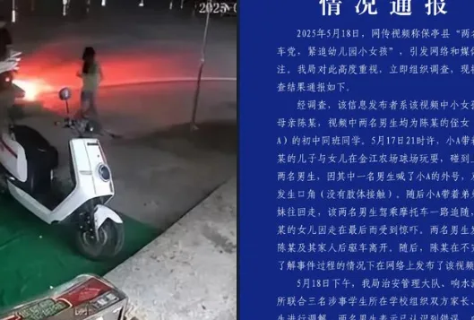 据通报,视频中两名男生为女孩母亲侄女小A的初中同班同学。当晚,两人因在路上喊了小A的外号引发口角,随后在返家途中骑摩托车尾随小A一行人,未实施任何实质性骚扰或伤害行为。