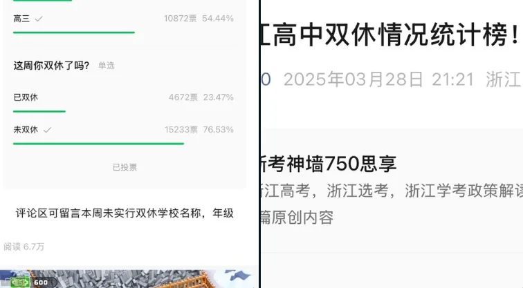 唐人日报3月29日讯:近日,由微信公众号“浙考神墙750”发起的一项关于高中生周末双休状况的调查引发关注。调查结果显示,绝大多数受访高中生在过去的一周中未能享受到双休日,反映出当前高中生面临的学习压力。