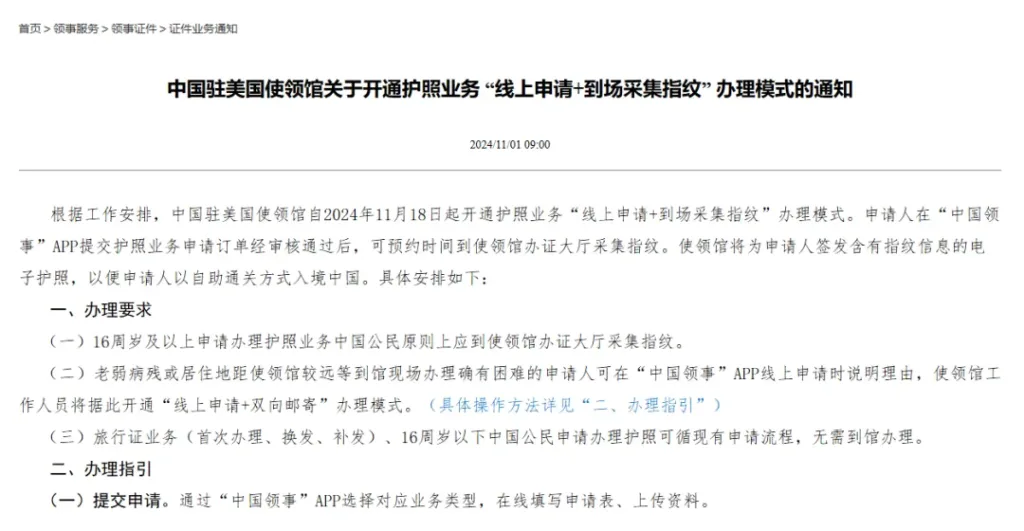据中领馆消息:从2024年11月18日起,中国公民办理护照需要到大使馆打指纹才能完成申请。