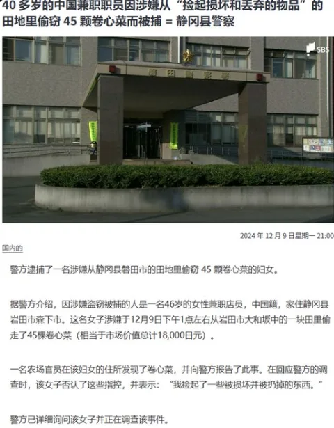 唐人日报12月13日讯:日本媒体近日报道,一名46岁的中国籍女性在静冈县磐田市被控偷走45颗卷心菜。警方称,该女子从一处田地中将卷心菜取走,随后遭到举报。