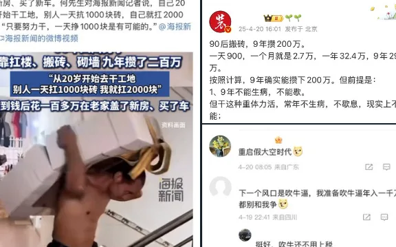 然而这则看似励志的故事,却在网络上引发了不小争议。有博主批评称:“以前鼓吹养几千头牛的个体致富是‘收割少数’,现在开始用搬砖故事祸害成千上万人。”还有声音指出,这类叙事试图美化超负荷劳作,掩盖现实中底层劳动者的困境。