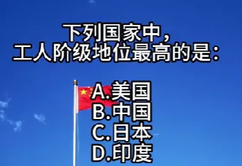 唐人日报5月9日讯:一位自媒体博主在社交平台发布视频,声称“在美国、中国、日本、印度这四个国家中,中国工人阶级的地位最高”,并将选项B:中国列为“正确答案”。该言论迅速在网络引发大量争议与嘲讽。