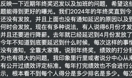 该员工称,截至目前,2024年度的年终奖仍未发放,且未收到任何正式通知解释延期原因或发放时间表。“去年已拖到4月,今年更是毫无音讯,听说可能要等到6月,并且还可能降薪,但一切都是传闻,全靠大家猜。”