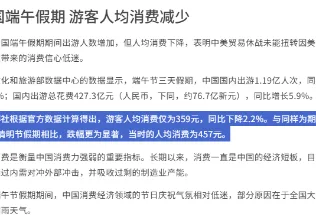 据彭博社援引上述数据计算,今年端午假期游客人均花费仅为359元,同比下降2.2%。更值得警惕的是,这一数字较同为三天假期的清明节更出现大幅下滑,当时人均消费高达457元,端午节期间人均消费骤降近百元,跌幅明显。
