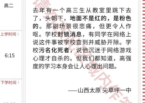 更令人愤怒的是,学校在内部通报中将死者污名化,称其因沉迷网络游戏导致心理问题而轻生。然而熟悉情况的学生纷纷指出,真正压垮这名同学的,是每天23:30才结束的高强度应试教学制度,以及长期被忽视的心理压力。