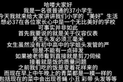 唐人日报6月19日讯:近日,一则由小学生发布的吐槽帖在网络上引发广泛关注。发帖人称,自己就读于太原市第三十七中小学部,学校不仅对初高中学生执行“比监狱还严”的管理制度,对小学生的管控同样严苛。虽然在执行程度上略有“宽容”,但依然让人感到压抑。