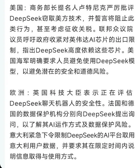 唐人日报2月2日讯:近日,DeepSeek公司遭到美国、英国、法国等十国封杀。美国商务部长提名人卢特尼严厉批评DeepSeek窃取美国技术,并表示将采取措施阻止此类行为,甚至考虑征收关税。欧洲方面,英国科技大臣表示正在对DeepSeek的聊天机器人进行安全性评估。意大利政府则紧急下令限制DeepSeek访问意大利用户数据。