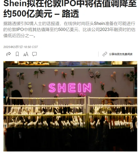 唐人日报2月8日讯:近日,Shein在伦敦首次公开募股(IPO)的估值降至500亿美元,较2023年融资时的估值下降了近四分之一。此前,美国总统特朗普宣布将终止对价值800美元或以下的美国进口商品的关税豁免,这一举措对Shein的商业前景构成打击,可能影响其盈利能力。